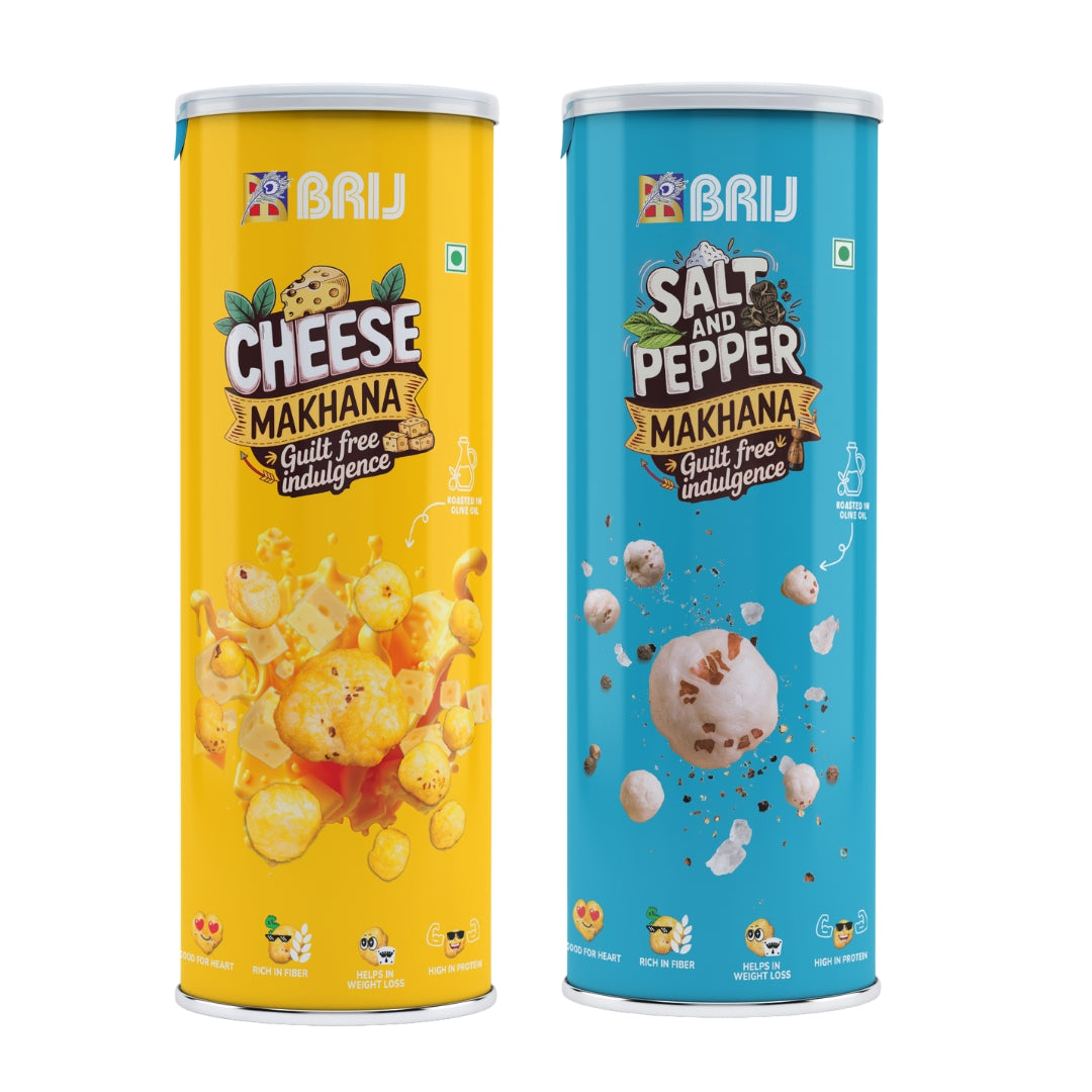 Enjoy the best of both worlds with Brij Makhana Combo, Brij Salt & Pepper and Brij Cheese Makhana the classic combo with a healthy twist. Perfectly balanced with Himalayan pink salt and a dash of black pepper and rich, savory taste of cheese, roasted in olive oil for that perfect guilt-free indulgence. Light, crispy, and bursting with flavor, whether you’re working, relaxing, or treating yourself during movie nights, this cheesy delight and classic salt is the ultimate comfort snack made the healthy way.